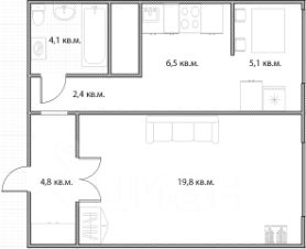 Светлая и уютная квартира с большой комнатой площадью почти 20 кв.м и изолированной кухней, разделённой на две функциональные зоны: удобную рабочую зону для готовки и полуизолированную обеденную зону для комфортных приёмов пищи.