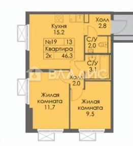 Продаётся 2-комнатная квартира площадью 46,3 кв. м на втором этаже 25-этажного дома, построенного из монолитных конструкций. Квартира с евроремонтом, комнаты изолированы, высота потолков — 2,5 м. Жилая площадь составляет 21,2 кв. м, кухня — 15,2 кв. м. В квартире два раздельных санузла, что обеспечивает дополнительное удобство.
