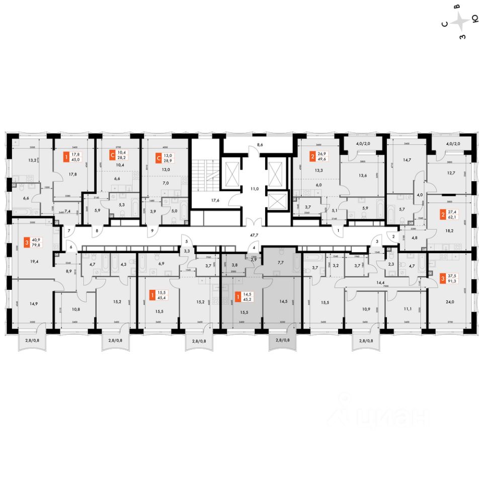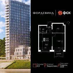 Продаётся 1-к квартира номер 203 общей площадью 45.2 кв.м. на 5-м этаже 16 этажного здания. Отделка Whitebox. Цена с учётом скидки.