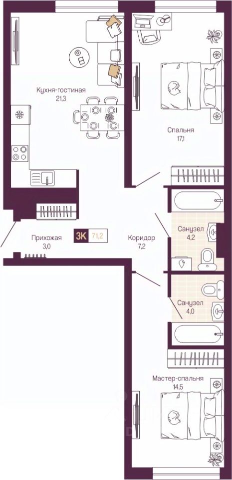 Двухкомнатная квартира с предчистовой отделкой в ЖК "Идель. Квартал на Сенной" на 15 этаже. Общая площадь: 71 кв.м., жилая: 31.6 кв.м., площадь просторной кухни-столовой: 21.3 кв.м. Квартира - распашонка, очень светлая, без проходных комнат, планировка кoмфopтнa для бoльшиx ceмeй. В квартире два совмещенных санузла. Высота потолков 3.0 м.