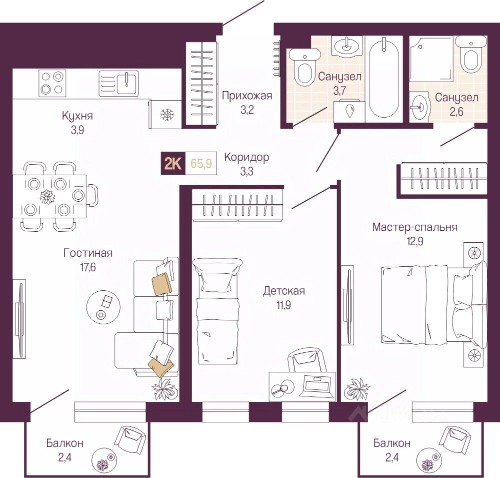 2-комн. квартира от застройщика с предчистовой отделкой в ЖК "Идель. Квартал на Сенной" на 2 этаже. Общая площадь: 64.3 кв.м., жилая: 24.8 кв.м., площадь просторной кухни-столовой: 20.5 кв.м. Комнаты изолированные, все окна выходят на одну сторону. В квартире два балкона, два совмещенных санузла. Высота потолков 3.0 м.