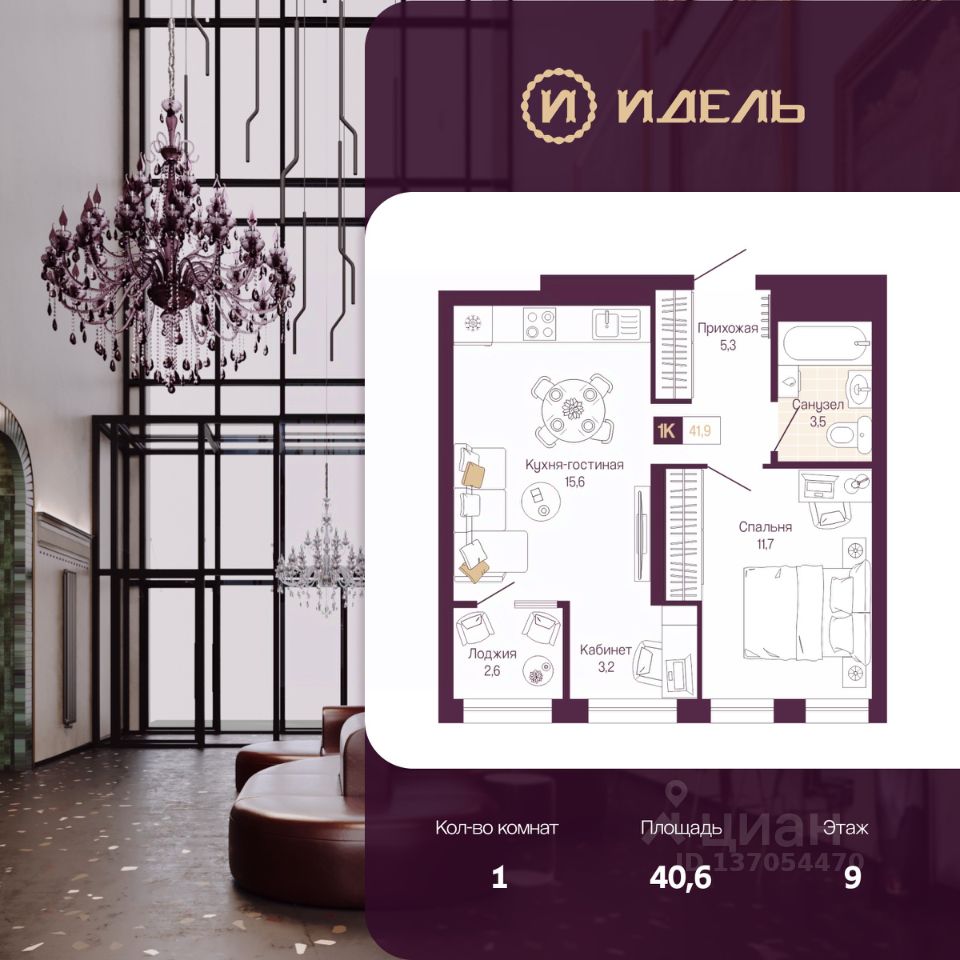 Просторная 1-комн. квартира с предчистовой отделкой в ЖК "Идель. Квартал на Сенной" на 9 этаже. Общая площадь: 40.6 кв.м., жилая: 11.7 кв.м., площадь просторной кухни-столовой: 15.6 кв.м. Все окна выходят на одну сторону. В квартире одна лоджия, один совмещенный санузел. Высота потолков 2.8 м.