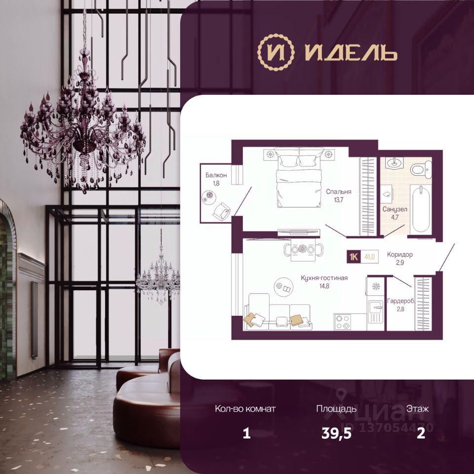 1-комн. квартира от застройщика с предчистовой отделкой в ЖК "Идель. Квартал на Сенной" на 2 этаже. Общая площадь: 39.5 кв.м., жилая: 13.7 кв.м., площадь просторной кухни-столовой: 14.8 кв.м. Все окна выходят на одну сторону. В квартире один балкон, один совмещенный санузел. Высота потолков 2.8 м.