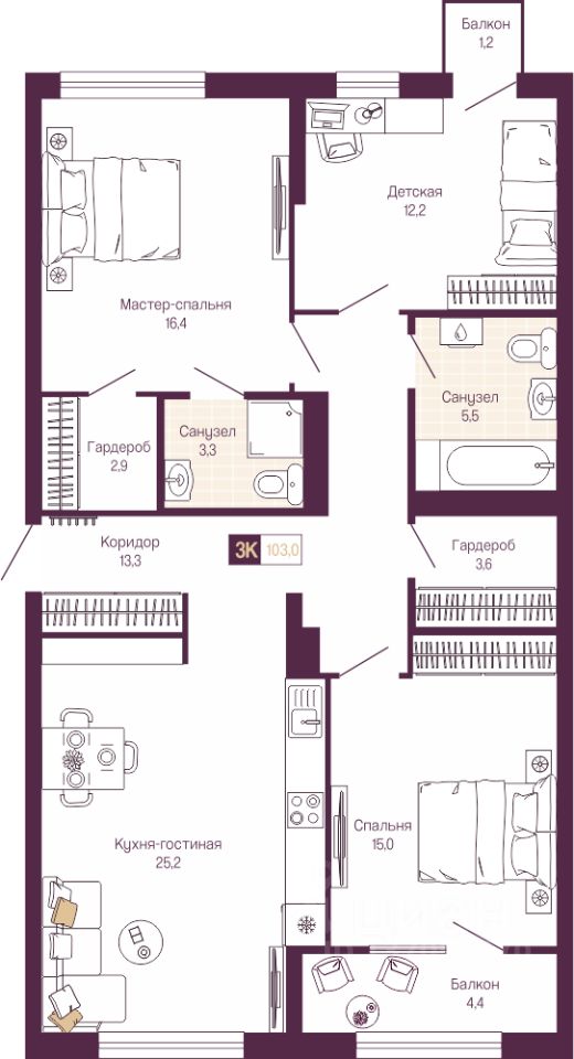Продается трехкомнатная квартира с предчистовой отделкой в ЖК "Идель. Квартал на Сенной" на 3 этаже. Общая площадь: 99.9 кв.м., жилая: 43.6 кв.м., площадь просторной кухни-столовой: 25.2 кв.м. Квартира - распашонка, без проходных комнат, окна выходят на paзные стороны дома. В квартире один балкон и одна лоджия, два совмещенных санузла. Высота потолков 3.0 м.