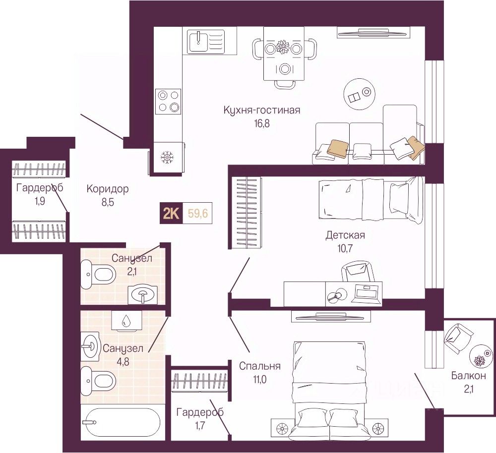 Просторная 2-комн. квартира с предчистовой отделкой в ЖК "Идель. Квартал на Сенной" на 4 этаже. Общая площадь: 58.1 кв.м., жилая: 21.7 кв.м., площадь просторной кухни-столовой: 16.8 кв.м. Комнаты изолированные, все окна выходят на одну сторону. В квартире один балкон, один совмещенный и один раздельный санузел. Высота потолков 3.0 м.