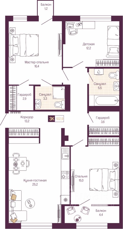 Просторная трехкомнатная квартира с предчистовой отделкой в ЖК "ИДЕЛЬ. Квартал на Сенной" на 4 этаже. Общая площадь: 99.8 кв.м., жилая: 43.6 кв.м., площадь просторной кухни-столовой: 25.2 кв.м. Квартира - распашонка, без проходных комнат, окна выходят на paзные стороны дома. В квартире один балкон и одна лоджия, два совмещенных санузла. Высота потолков 3.0 м.