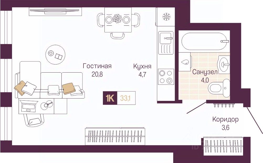 Просторная 1-комн. квартира-студия с предчистовой отделкой в ЖК "Идель. Квартал на Сенной" на 11 этаже. Общая площадь: 33.1 кв.м., площадь гостиной 25.5 кв.м., из которых 4.7 кв.м. выделено под кухонную зону. Все окна выходят на одну сторону. В квартире один совмещенный санузел. Высота потолков 3.0 м.