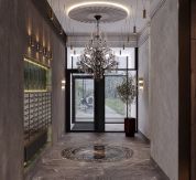 Гранд-лобби с переговорной, кофейней, постоматом, мягкой зоной ожидания. Авторский дизайн холлов с отделкой мрамором, камнем, деревом, керамикой. Роскошная люстра в экстерьере — визитная карточка квартала. В МОПах колясочная, гостевой санузел, лапомойки. Бесшумные лифты можно вызвать без использования рук.