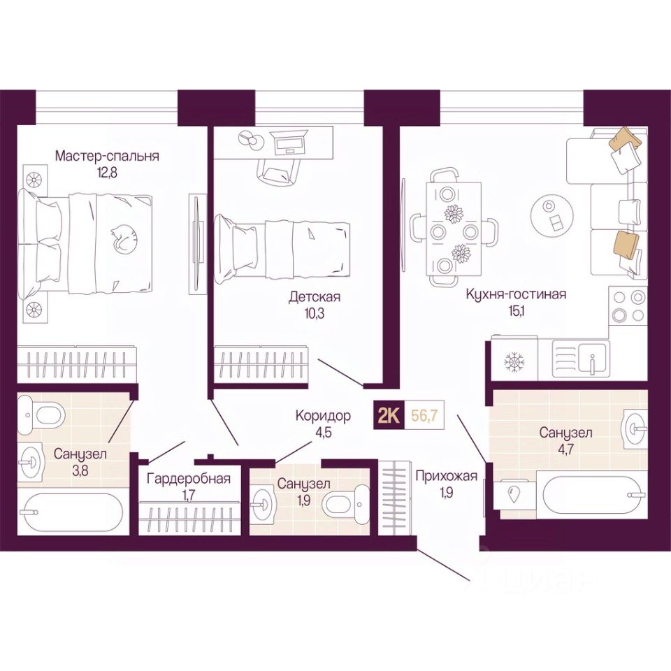 Продается 2-комн. квартира от застройщика с предчистовой отделкой в ЖК "ИДЕЛЬ. Квартал на Сенной" на 4 этаже. Общая площадь: 56.7 кв.м., жилая: 23.1 кв.м., площадь просторной кухни-столовой: 15.1 кв.м. Комнаты изолированные, все окна выходят на одну сторону. В квартире один совмещенный и один раздельный санузел. Высота потолков 3.0 м.