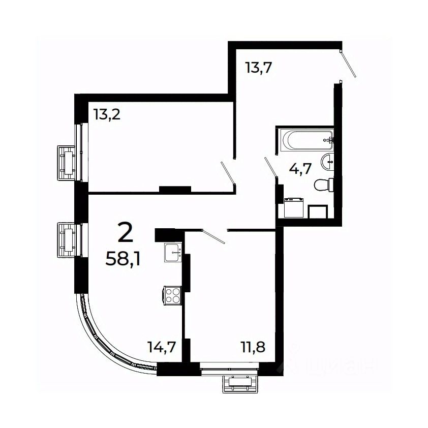 Продается 2-комнатная квартира площадью 58,1 кв.м на 12 этаже 19 этажного дома 3 в ЖК Сормово Парк.