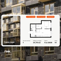 Продаётся 1-комн. квартира площадью 34,7 кв.м на 14 этаже 25 этажного дома (Корпус 10, Секция 1) проекта ПИК Савин парк. Светлый просторный подъезд на уровне земли, функциональная планировка, большие окна, c отделкой.
