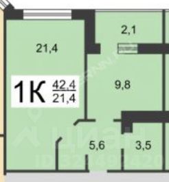 Площадь квартиры с лоджией: 44,5 м² (лоджия - 4,2 м², кухня 9,8 м², комната - 21,4 м²).