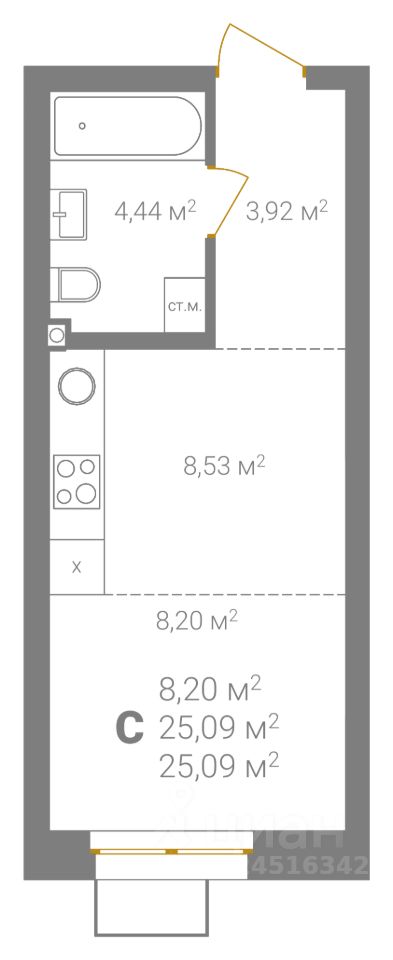 Общая площадь25,09 м²