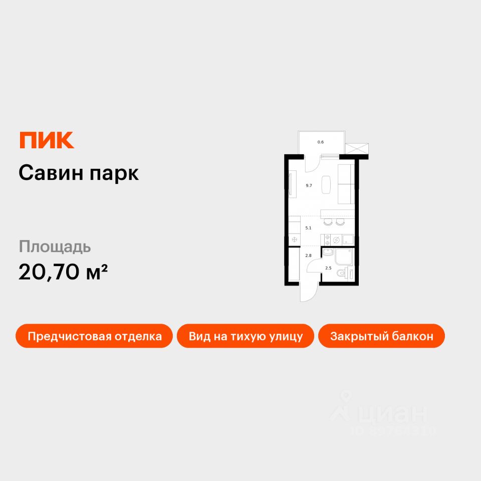 Продаётся квартира-студия площадью 20,7 кв.м на 13 этаже 25 этажного дома (Корпус 8, Секция 1) проекта ПИК Савин парк. Светлый просторный подъезд на уровне земли, функциональная планировка, большие окна, предчистовая отделка.