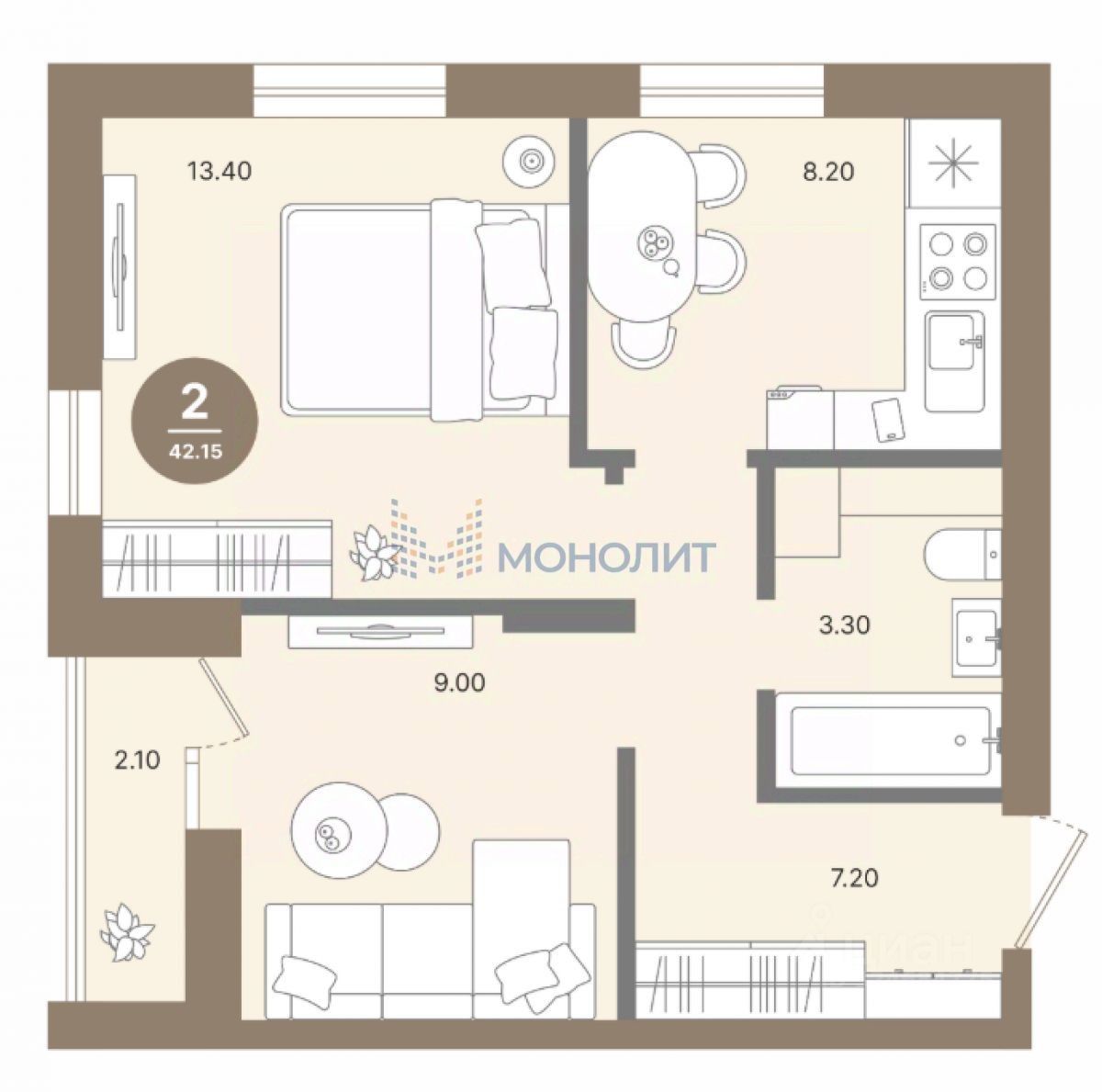 В продаже 2-комнатная квартира 42.15 кв.м. в новом строящемся ЖК "ЧКАLOV"