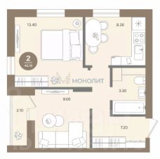 Площадь комнат 13.4 м.кв. и 9 м.кв.