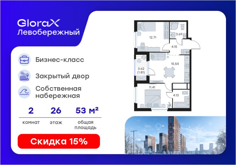 Продается 2-комн. квартира на 26-м этаже в строящемся проекте бизнес-класса GloraX Левобережный. Общая площадь лота составляет 53,44 кв. м, из которых 24,12 кв. м отведено под жилую и 15,54 кв. м под кухонную зону. Номер квартиры - 445.