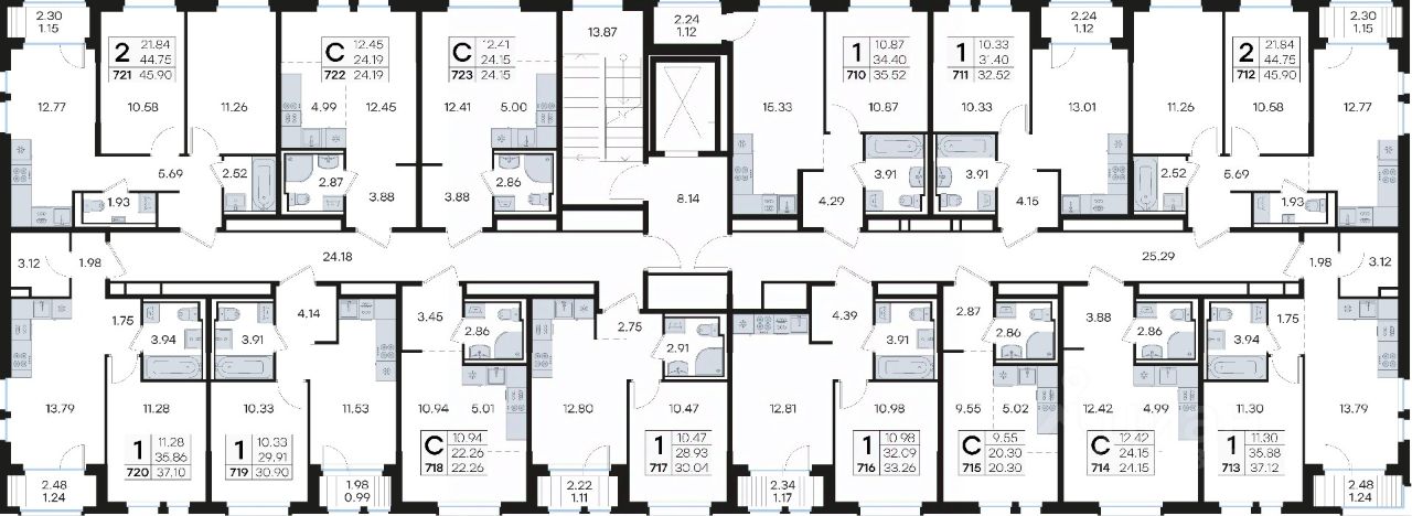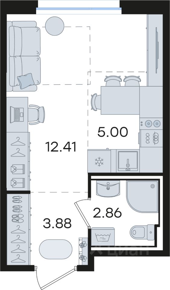 Продается квартира-студия на 9-м этаже в строящемся проекте комфорт-класса GloraX Новинки. Общая площадь лота составляет 24,15 кв. м, из которых 12,41 кв. м отведено под жилую и 5,00 кв. м под кухонную зону. Номер квартиры - 723.