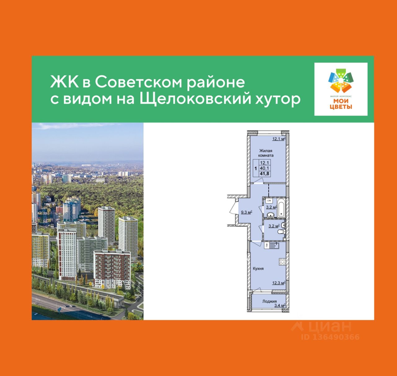 1-комн. квартира с предчистовой отделкой в ЖК "Мои Цветы" на 1 этаже. Общая площадь: 41.8 кв.м., жилая: 12.1 кв.м., площадь просторной кухни-столовой: 12.3 кв.м. Квартира - распашонка, без проходных комнат, окна выходят на paзные стороны дома. В квартире одна лоджия, один раздельный санузел. Высота потолков 2.65 м.