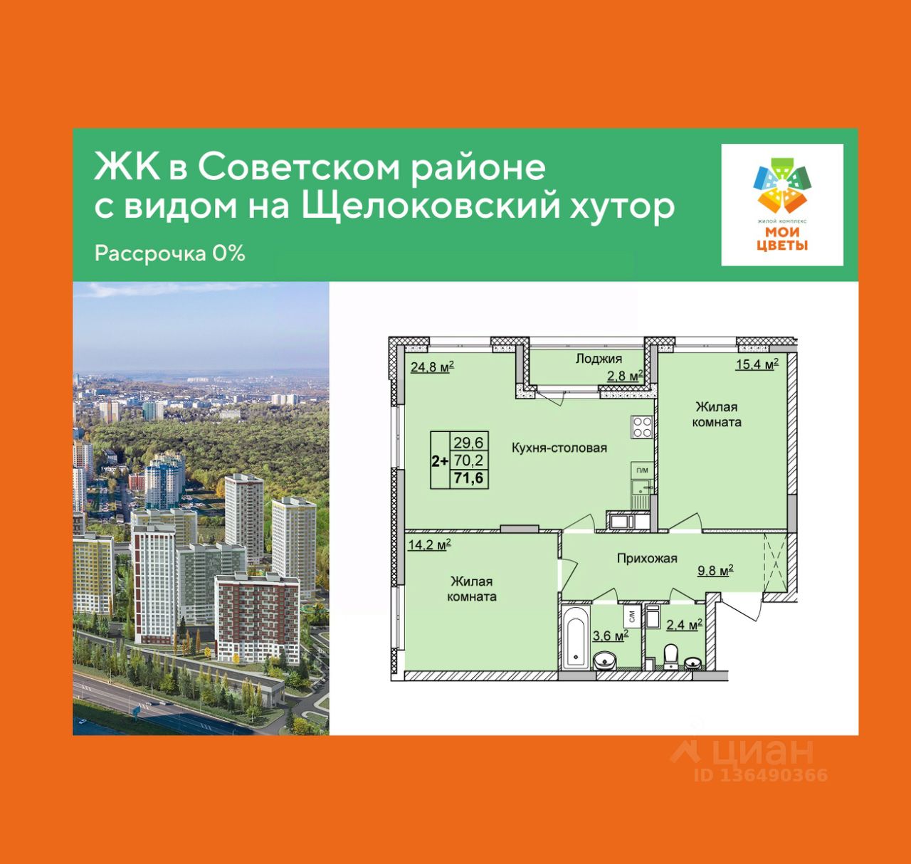 2-комн. квартира с отделкой в ЖК "Мои Цветы" на 4 этаже. Общая площадь: 71.6 кв.м., жилая: 29.6 кв.м., площадь просторной кухни-столовой: 24.8 кв.м. Угловая квартира, окна oбecпeчивaют paвнoмepнoe ocвeщeниe в тeчeниe дня. В квартире одна лоджия, один раздельный санузел. Высота потолков 2.65 м.