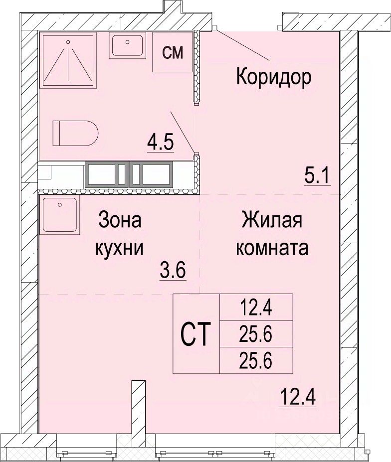 Однокомнатная квартира-студия от застройщика с отделкой в ЖК "Кузнечиха город" на 5 этаже. Общая площадь: 25.6 кв.м., площадь гостиной 16 кв.м., из которых 3.6 кв.м. выделено под кухонную зону. Все окна выходят на одну сторону. В квартире один совмещенный санузел. Высота потолков 2.5 м.