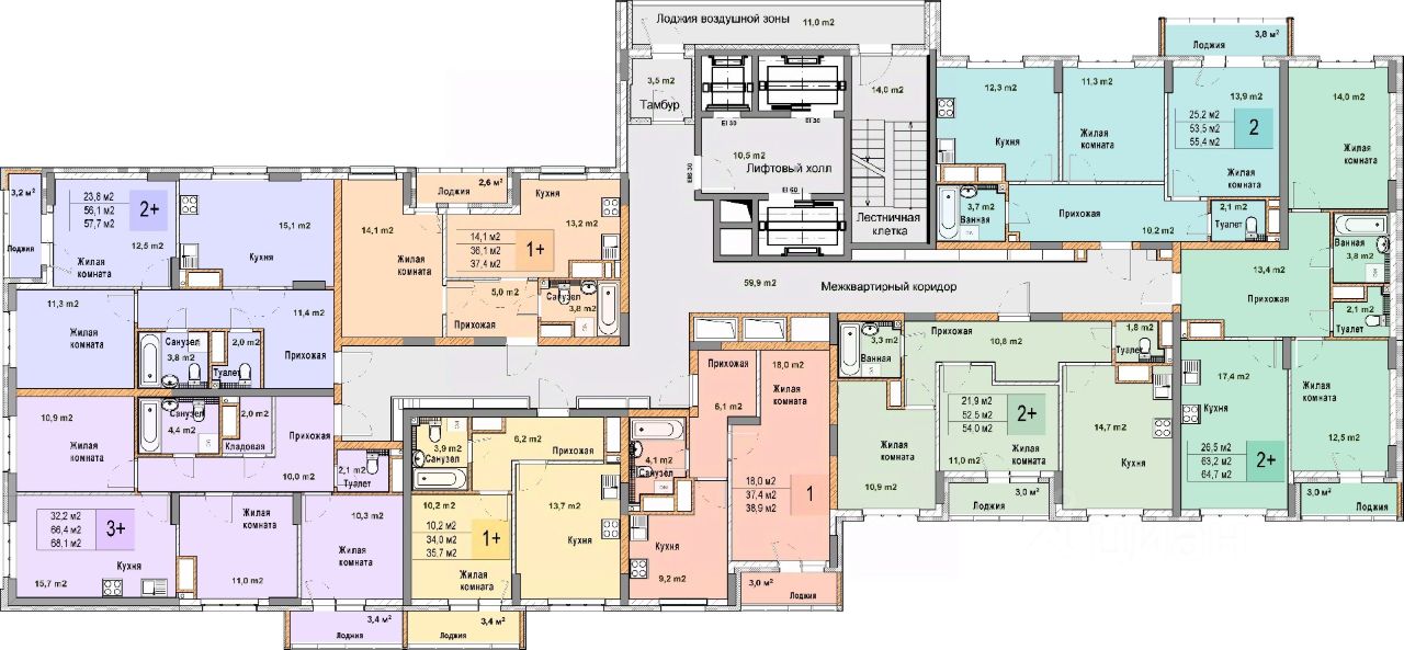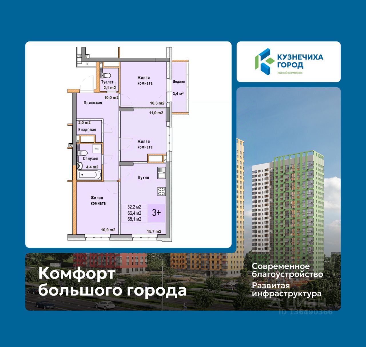 Трехкомнатная квартира в ЖК "Кузнечиха город" на 22 этаже. Общая площадь: 68.1 кв.м., жилая: 32.2 кв.м., площадь просторной кухни-столовой: 15.7 кв.м. Высота потолков 2.7 м.