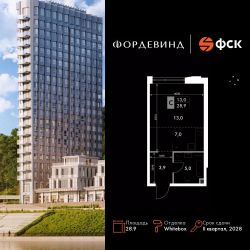 Продаётся квартира-студия номер 235 общей площадью 28.9 кв.м. на 8-м этаже 16 этажного здания. Отделка Whitebox. Цена с учётом скидки.