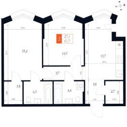 Продаётся 2-к квартира номер 77 общей площадью 61.7 кв.м. на 10-м этаже 20 этажного здания. Отделка Whitebox. Цена с учётом скидки.