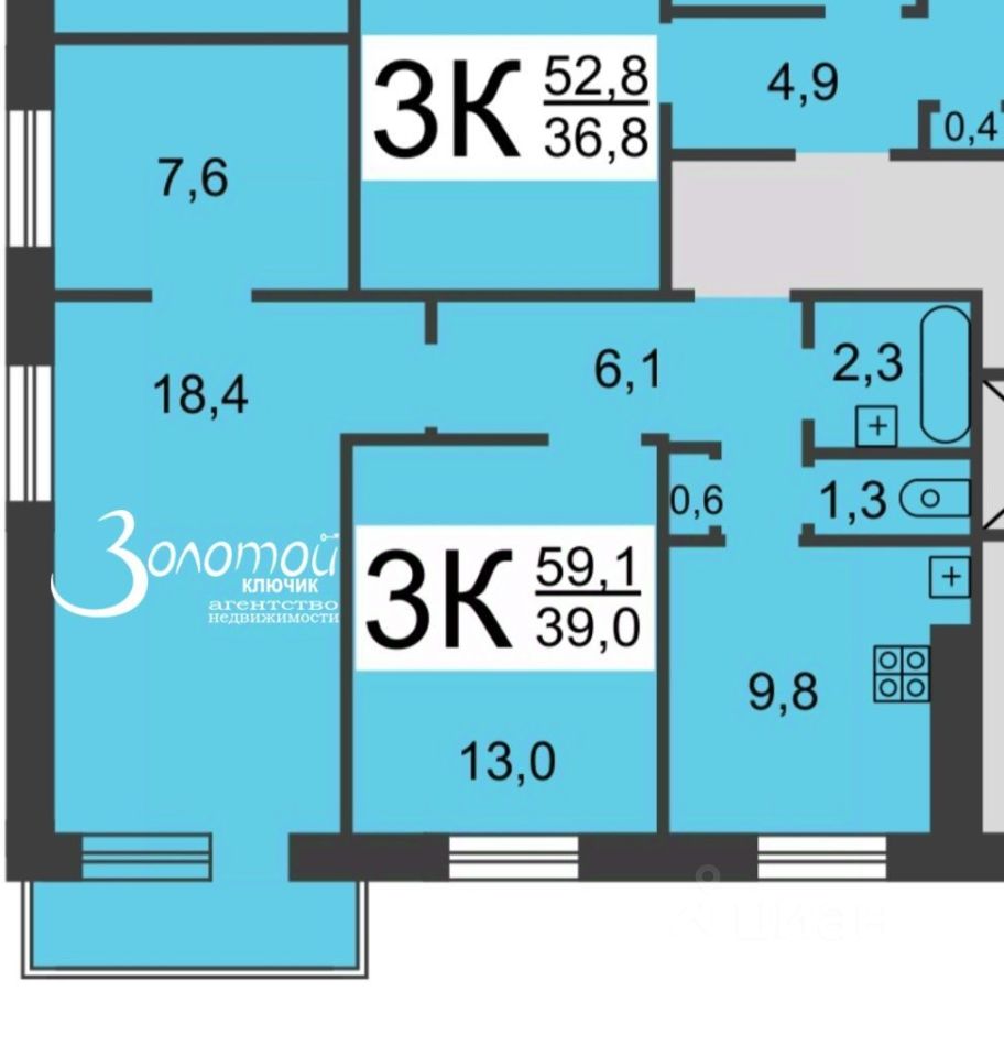 -Комнаты: 18.4 кв. м., 13 кв. м., 7.6 кв. м.