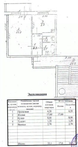 Квартира расположена на 5 этаже 5-ти этажного панельного дома, общая площадь 33,1 кв.м, комната 17 кв.м., кухня 8 кв.м. Сан. узел раздельный. Лоджия 3м. Есть небольшая кладовка на первом этаже.