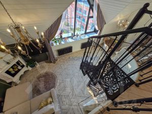 Винтовая лестница соединяет два уровня квартиры под купольными потолками. Большие трапециевидные окна с видом на город и Волгу добавляют масштабную игру натурального света в композицию интерьера.