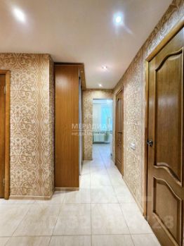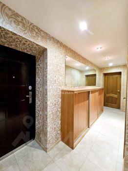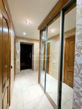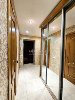 Напольное покрытие в комнатах - линолеум, а на кухне и в прихожей керамогранит. В прихожей установлен натяжной потолок со встроенными спотами.