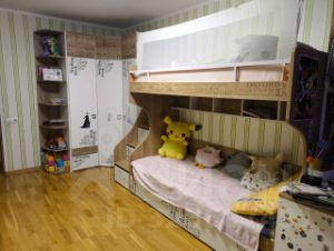 В детской комнате: двухъярусная кровать, встроенные шкафы, удобный письменный стол свой спортивный уголок. Дворик за окном - тихий и зелёный, с закрытой детской площадкой прямо у подъезда.