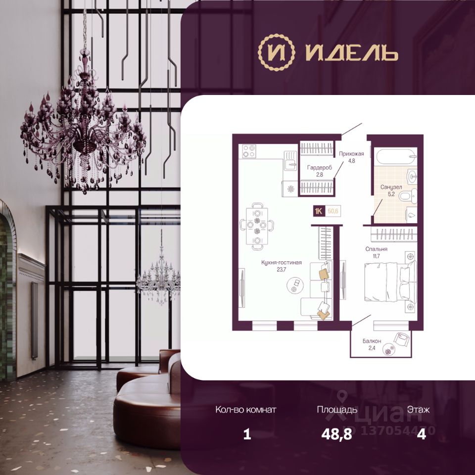 1-комн. квартира с предчистовой отделкой в ЖК "Идель. Квартал на Сенной" на 4 этаже. Общая площадь: 48.8 кв.м., жилая: 11.7 кв.м., площадь просторной кухни-столовой: 23.7 кв.м. Все окна выходят на одну сторону. В квартире один балкон, один совмещенный санузел. Высота потолков 2.8 м.