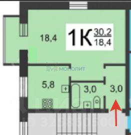 Общая площадь квартиры 30,5 кв.м., жилая 18,4 кв.м., кухня 5,8 кв.м, балкон застеклён. Окна выходят во двор.