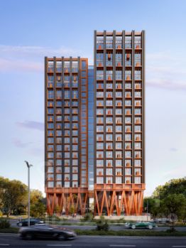 Архитектурный проект нового жилого комплекса был разработан именитым бюро "Остоженка". Отделка фасадов выполнена из кирпича и кортеновой стали, что в сочетании с панорамным остеклением, придает ему выразительный облик. Первый этаж запроектирован на высоте 13 метров. Таким образом, просторная входная группа имеет высоту потолков 10 метров, что делает ее интерьер уникальным. Благодаря расположению и продуманной архитектуре из каждой квартиры как на верхних, так и на нижних уровнях будут открываться живописные виды.
