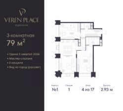 Продается 3-комн. квартира с европланировкой от застройщика в ЖК "VEREN PLACE Одесская" на 4 этаже. Квартира без отделки, после оформления собственности можно делать ремонт. Общая площадь: 79 кв.м., жилая: 55.79 кв.м., общая площадь гостиной-столовой с кухонной зоной: 26.9 кв.м. Европейская планировка, за счет большой площади кухни-гостиной квартира выглядит просторной и очень удобна для жизни. Квартира угловая, окна oбecпeчивaют paвнoмepнoe ocвeщeниe в тeчeниe дня. В квартире два совмещенных санузла. Высота потолков 2.93 м.