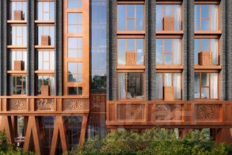 Архитектурный проект нового жилого комплекса был разработан именитым бюро "Остоженка". Отделка фасадов выполнена из кирпича и кортеновой стали, что в сочетании с панорамным остеклением, придает ему выразительный облик. Первый этаж запроектирован на высоте 13 метров. Таким образом, просторная входная группа имеет высоту потолков 10 метров, что делает ее интерьер уникальным. Благодаря расположению и продуманной архитектуре из каждой квартиры как на верхних, так и на нижних уровнях будут открываться живописные виды.