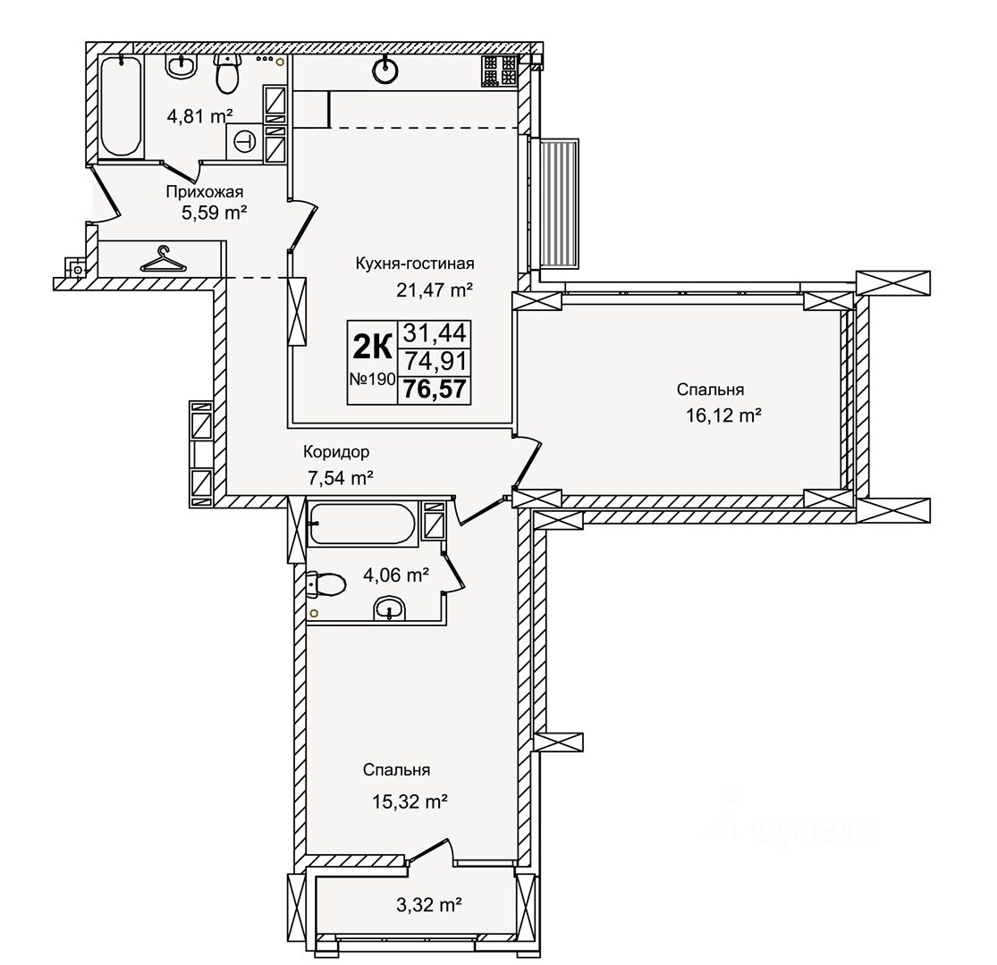 Общая площадь76,57 м²