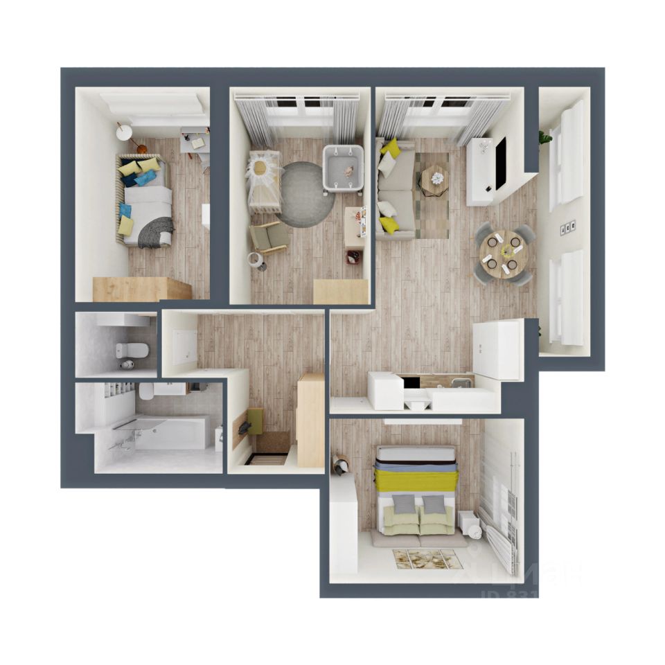 Общая площадь — 85.57 м², 13 этаж. Свободная планировка под ваш дизайн-проект.