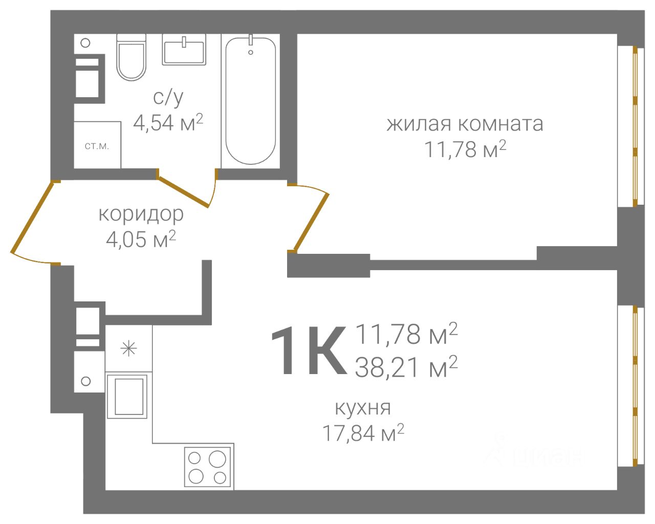 Общая площадь38,21 м²