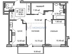 Продаётся квартира по плану — двухкомнатная (77,08 м²), но по факту — полноценная трёхкомнатная! Собственник грамотно переоборудовал большую гардеробную (7,35 м²) в функциональный кабинет, в результате вы получаете дополнительную комнату — идеально для удаленной работы