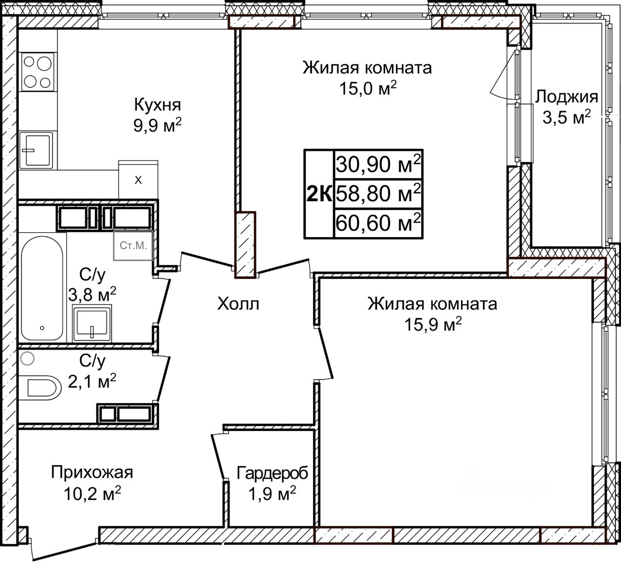 60,6 м²