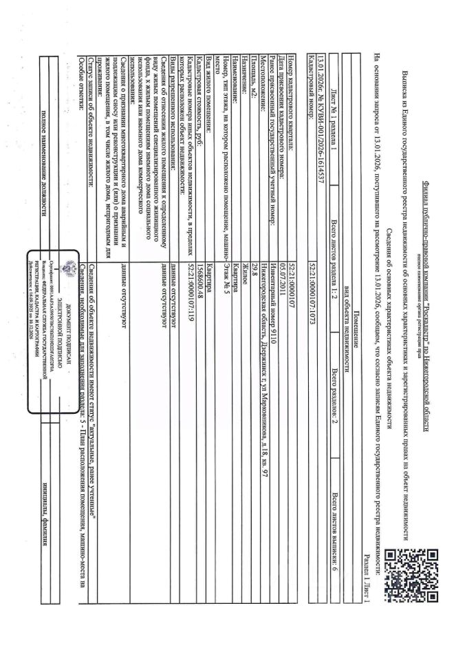 Квартира (жилое) общей площадью 29,8 кв.м, этаж 5, кол-во зарегистрированных 1 человек, кадастровый (или условный) номер 52:21:0000107:1073. Адрес: Нижегородская обл., г. Дзержинск, ул. Марковникова, д. 18, кв. 97. Должник Мисюра А.С.