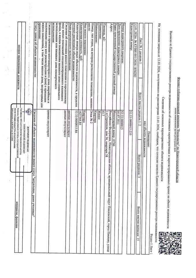 Квартира (жилое) общей площадью 43,7 кв.м, этаж 2, кол-во зарегистрированных 2 человека, кадастровый (или условный) номер 52:33:0000015:235. Адрес: Нижегородская обл., г. Павлово, ул. 1-я Строителя, д. 36, кв. 38. Должник Ануфриева Я.В.