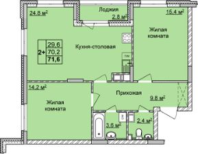 Просторная 2-комн. квартира с отделкой в ЖК "Мои Цветы" на 9 этаже. Общая площадь: 71.6 кв.м., жилая: 29.6 кв.м., площадь просторной кухни-столовой: 24.8 кв.м. Квартира угловая, очень светлая, естественная вентиляция при открытии окон. В квартире одна лоджия, один раздельный санузел. Высота потолков 2.65 м.