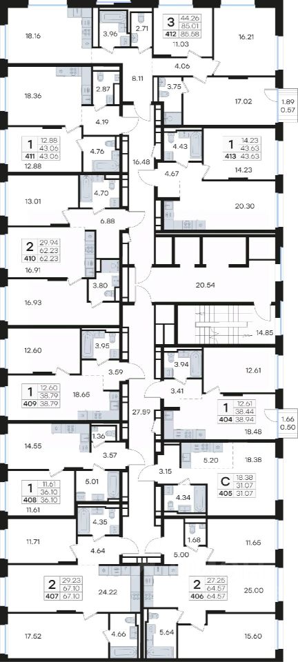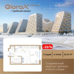 Продается квартира-студия на 6-м этаже в строящемся проекте премиум-класса GloraX Premium Гребной канал. Общая площадь лота составляет 31,07 кв. м, из которых 18,38 кв. м отведено под жилую и 5,20 кв. м под кухонную зону. Номер квартиры - 405.