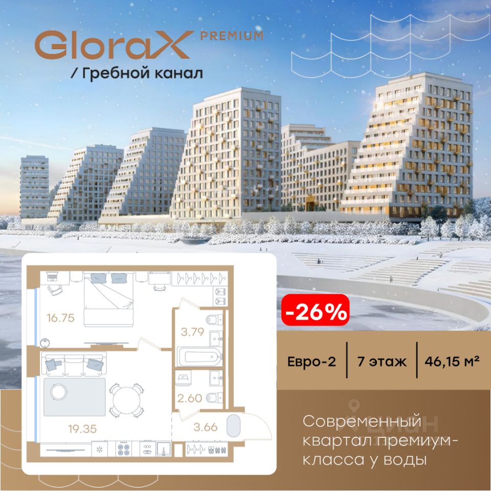 Продается 1-комн. квартира на 7-м этаже в строящемся проекте премиум-класса GloraX Premium Гребной канал. Общая площадь лота составляет 46,15 кв. м, из которых 16,75 кв. м отведено под жилую и 19,35 кв. м под кухонную зону. Номер квартиры - 507.