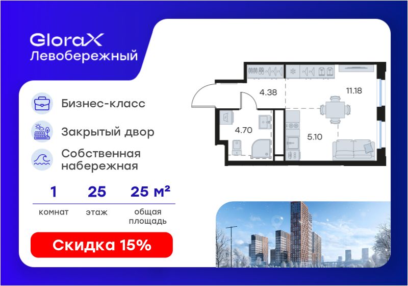Продается квартира-студия на 25-м этаже в строящемся проекте бизнес-класса GloraX Левобережный. Общая площадь лота составляет 25,36 кв. м, из которых 11,18 кв. м отведено под жилую и 5,10 кв. м под кухонную зону. Номер квартиры - 429.