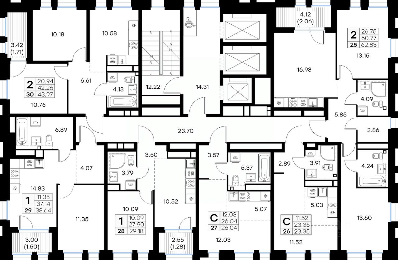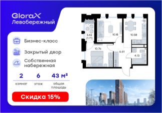 Продается 2-комн. квартира на 6-м этаже в строящемся проекте бизнес-класса GloraX Левобережный. Общая площадь лота составляет 43,97 кв. м, из которых 20,94 кв. м отведено под жилую и 10,58 кв. м под кухонную зону. Номер квартиры - 30.